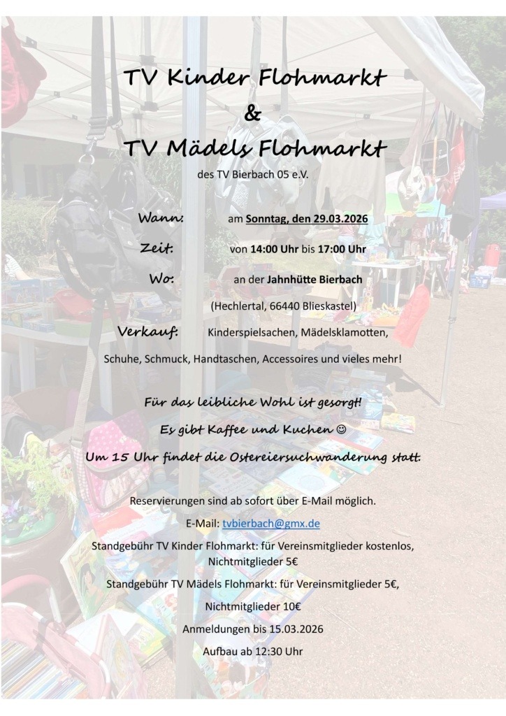 Am kommenden Sonntag, den 29.06.2025, veranstaltet der TV Bierbach von 14:00 – 17:00 Uhr den zweiten Kinder Flohmarkt an der Jahnhütte.